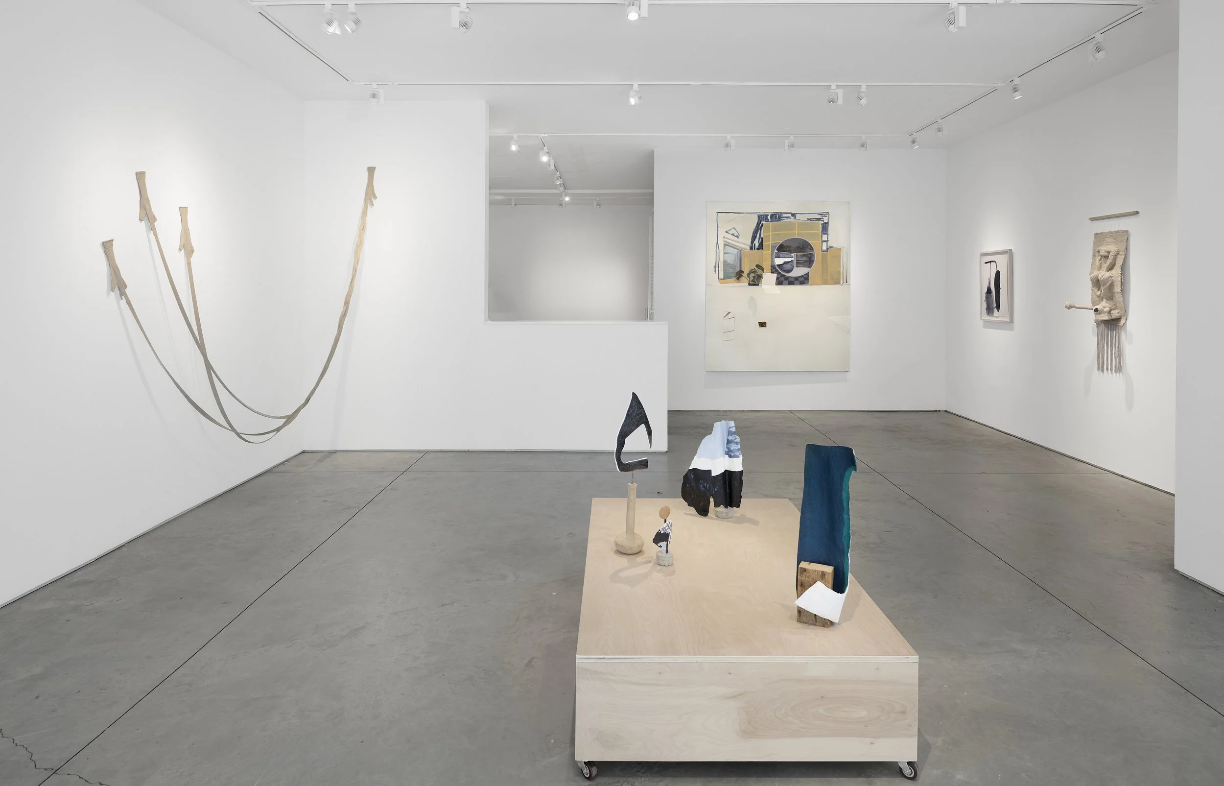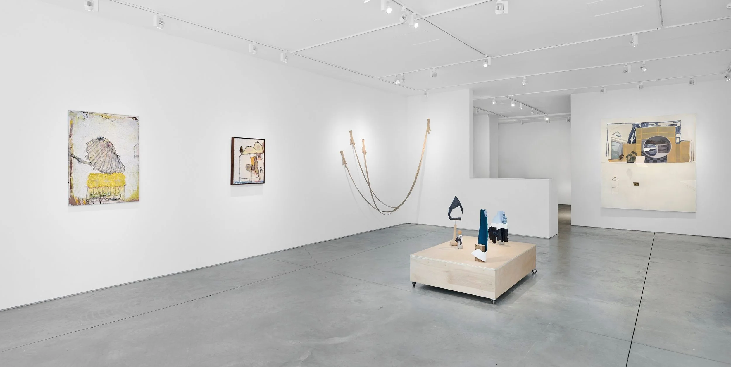 The large-format paintings are mounted on stretchers that act as shelves, holding up small pieces of other paintings or of sculptures. Alongside the objects and animations in the gallery, the paintings formulate tensions between macro and micro spaces; they signal relations tied to the mobile, the dynamic, and the frozen, and propose paradoxes between things that stand on their own and things that must be propped up.