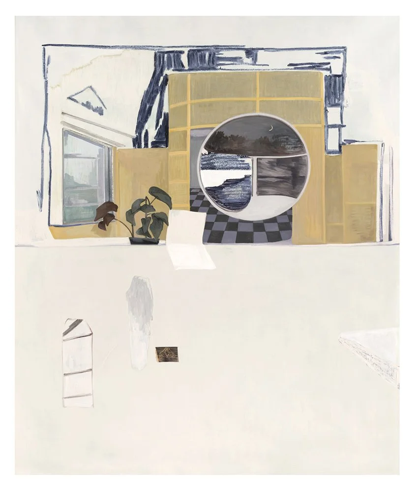 La pintura Hay que andar liviana en este mundo, o no (2023) superpone dos obras anteriores dándole forma a un cuerpo oval absorbido dentro de un paisaje lunar. En Retrato hablado (2023), un elemento semejante a una cacerola aparece rebosante de huevos pintados en una paleta de colores fríos. Quizás no nos volvamos del todo indiferentes (2023), presenta una construcción parecida a un gallinero con ventanas ciegas y graffitis románticos del tipo “tu y yo”, en una mitad de la tela, y un espacio inteligible en la otra. La convivencia de dualidades, las interrupciones y las composiciones inestables en las pinturas de Quirno evocan promesas, incomodidades, libertades y frustraciones en torno a cómo se moldean la subjetividad, la imaginación y las expectativas sobre el tiempo reproductivo del cuerpo.