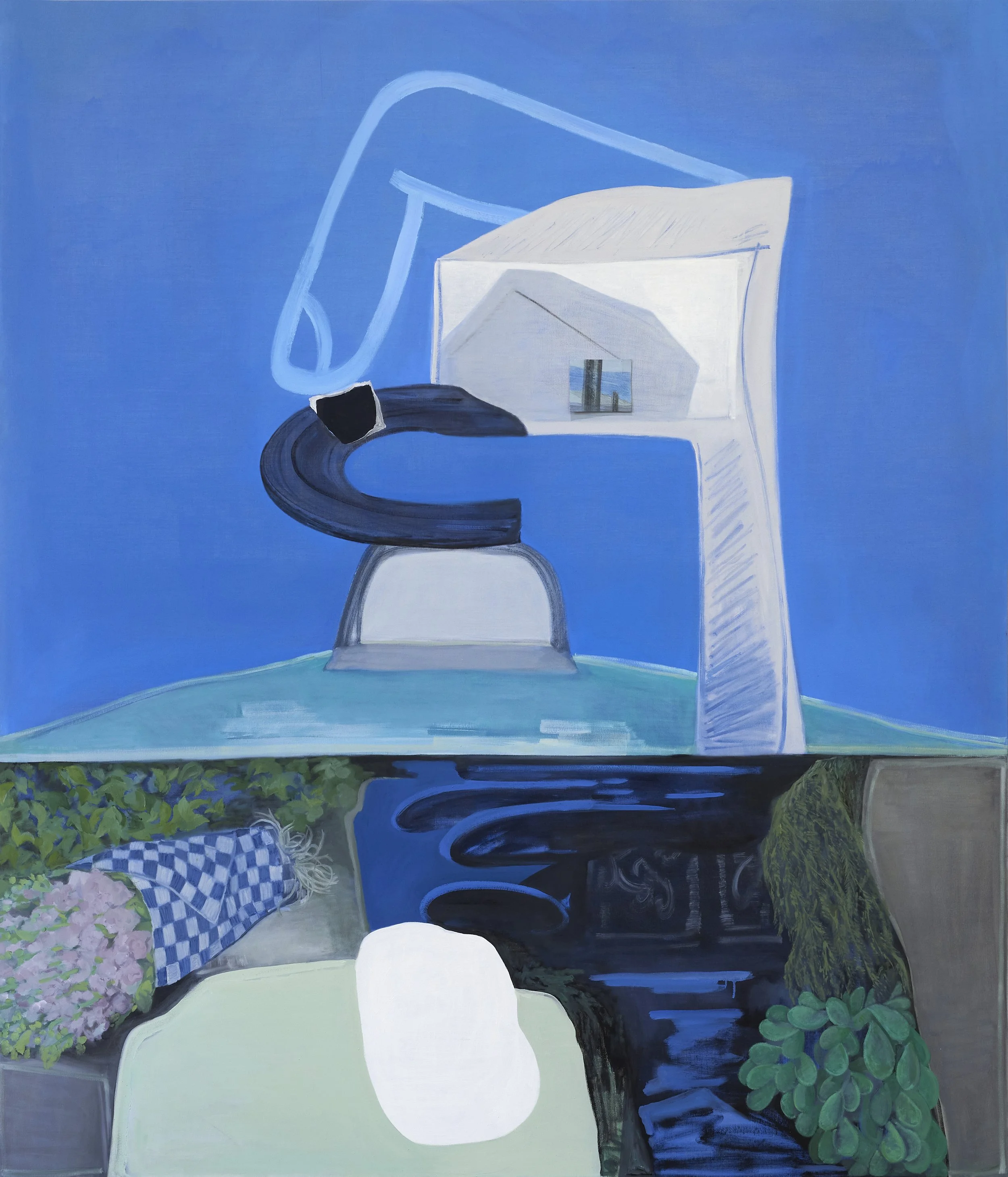 In the painting Hay que andar liviana en este mundo, o no [You Have to Travel Light through this World, Or Do You?] (2023), two earlier works are layered to give shape to an oval body in the midst of a moonscape. In Retrato hablado [Spoken portrait] (2023), eggs painted in cold tones flow copiously out of a snail-like element. One half of the canvas Quizás no nos volvamos del todo indife- rentes [Perhaps we won’t become completely indifferent] (2023) depicts a construction that looks like a henhouse with blind windows and romantic phrases such as “you and me” in graffiti-like print, and the other an intelligible space. The comingling of dualities, the interruptions, and the unstable compo- sitions in Quirno’s paintings suggest promises and discomforts, freedoms and frustrations regarding how subjectivity, imagination, and expectations about the reproductive time of the body are shaped. At play in Sofía Quirno’s studio practice is the joining of different materialities to compose immersive installations where the elements in the space resonate in one another.